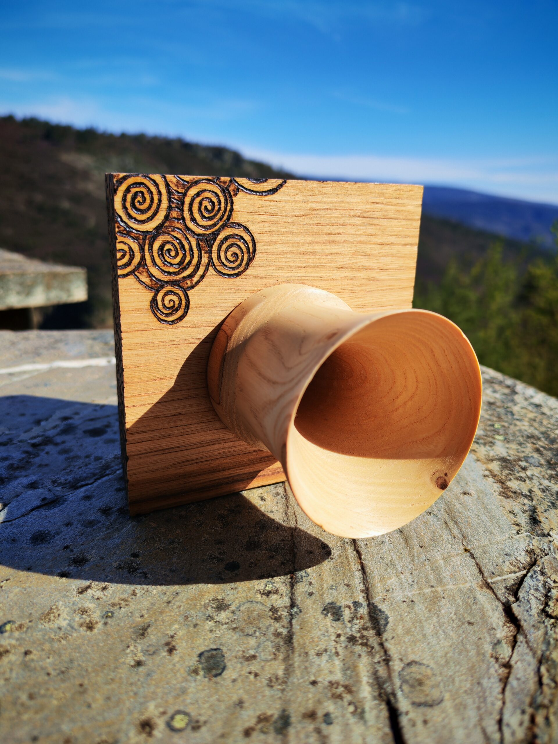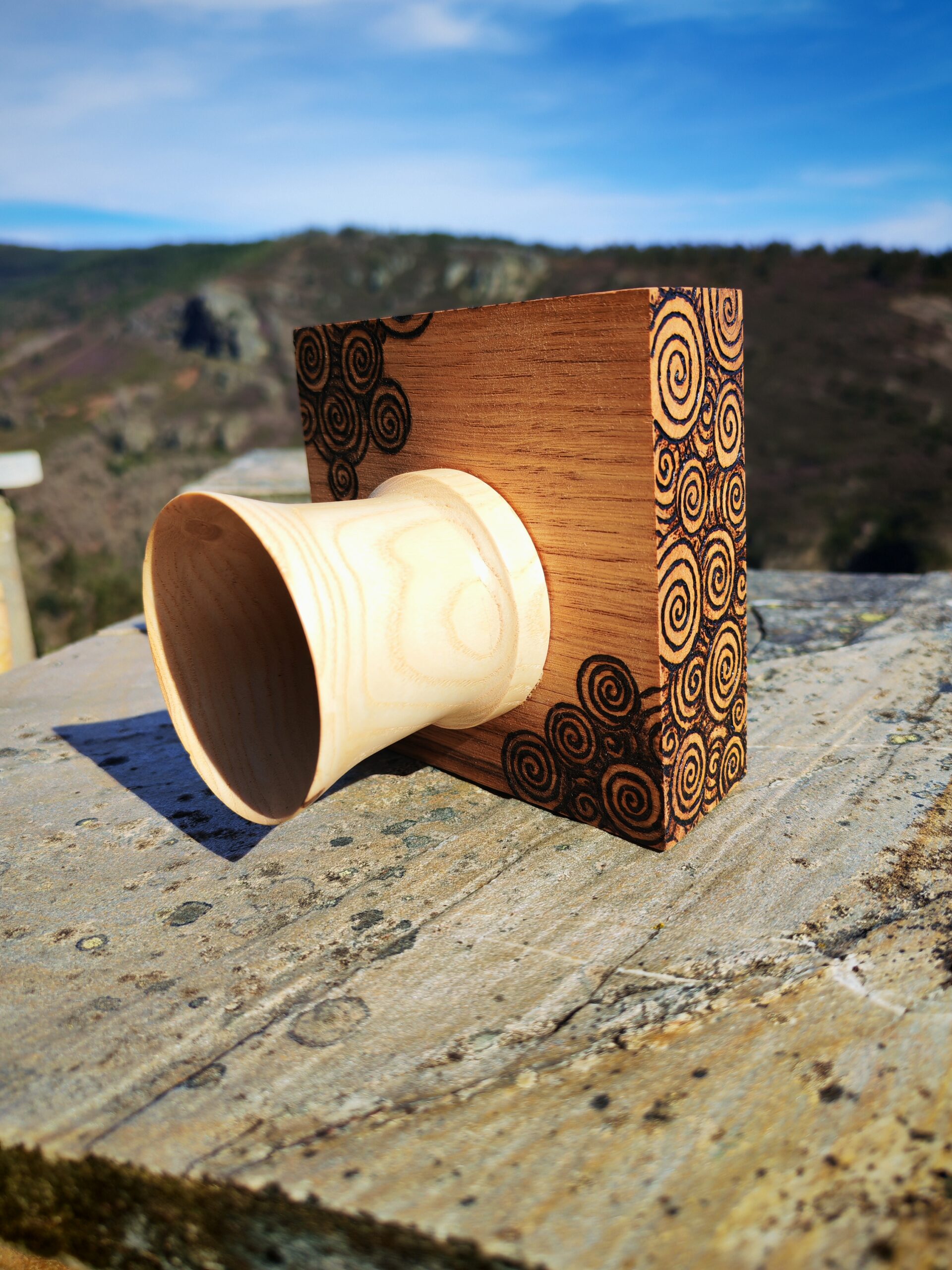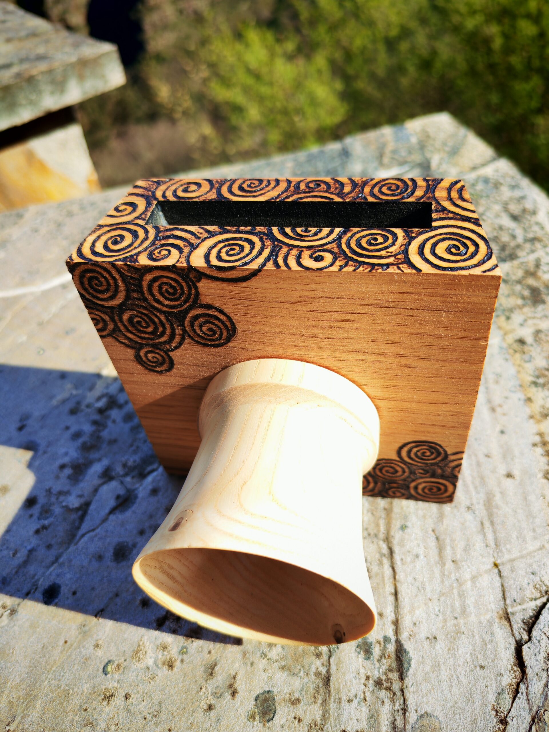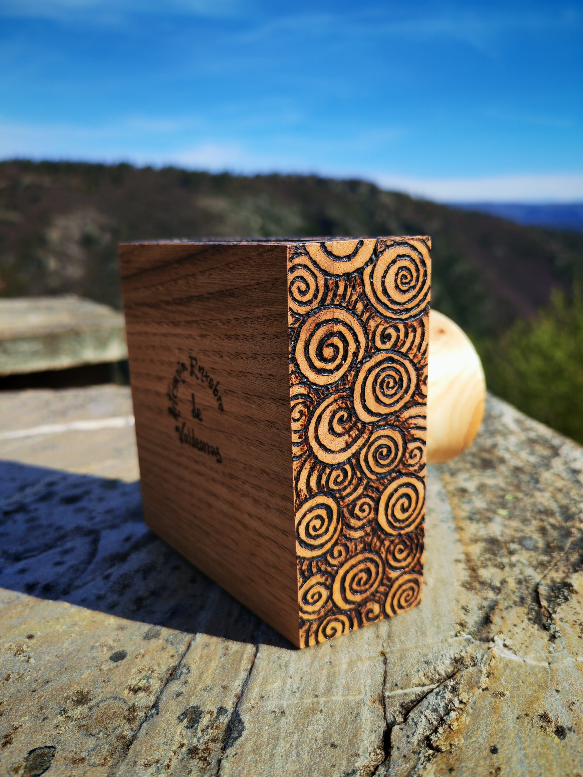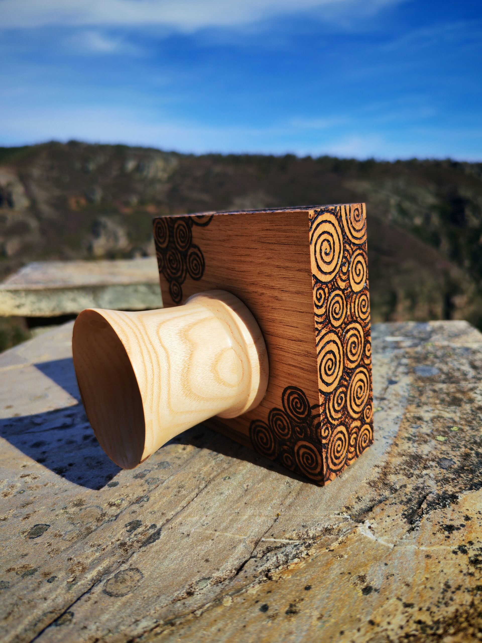 As catro caras do corpo están cubertas dun pirogravado de espirais celtas realizado a man. Un motivo que leva milenios ligado á cultura galega e que aquí non é decoración: é a linguaxe visual da peza. Cada espiral queimada na madeira é única, como a peza que a sostén.